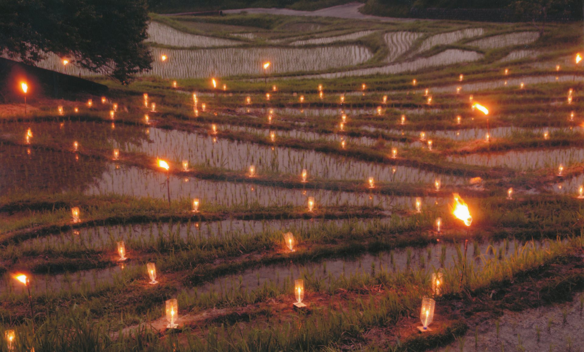 今年も写真部の皆さんが400本のロウソクをあぜ道に立て幻想的な棚田の夜を演出します。