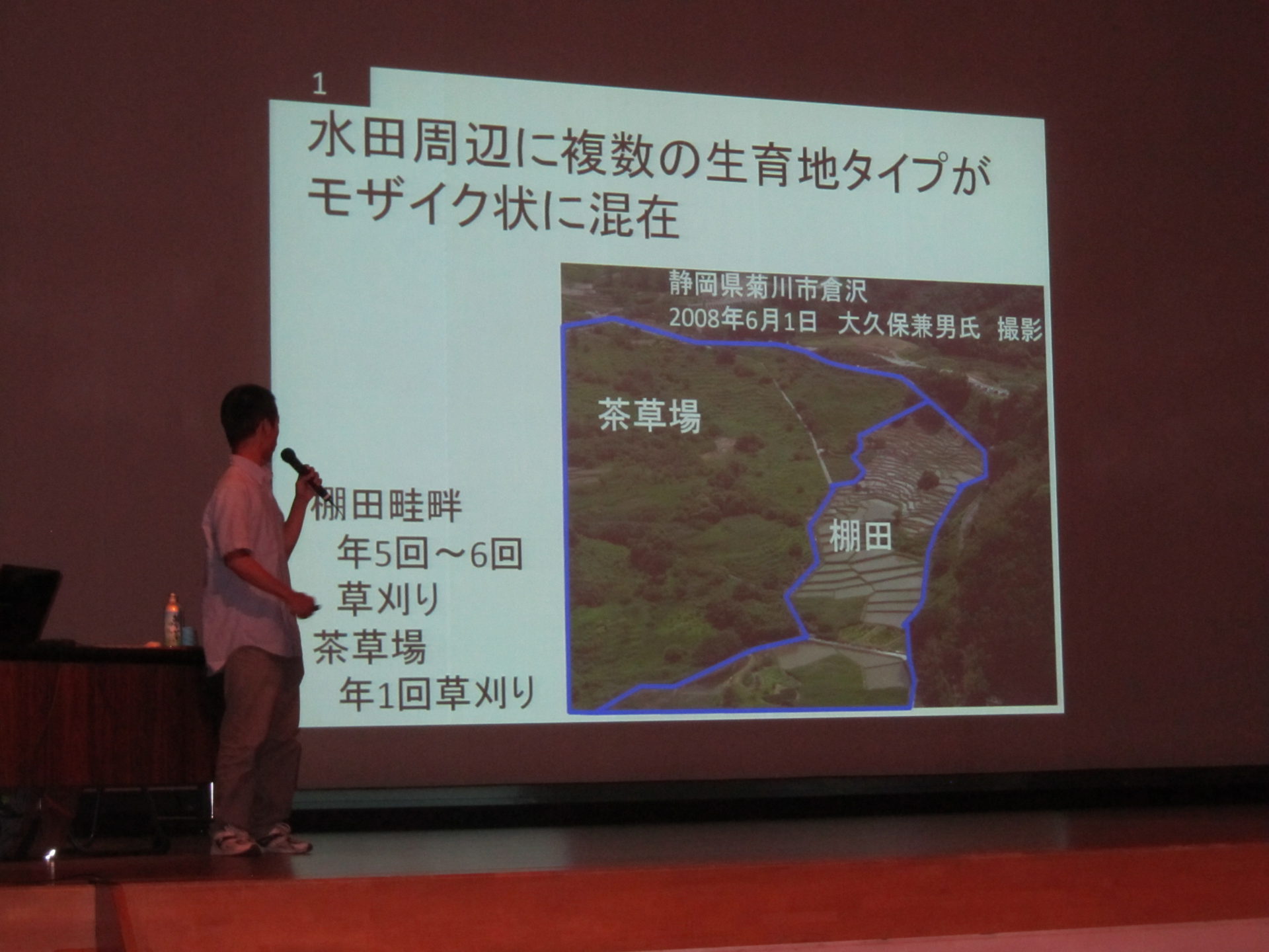 午前中に視察事前説明会を行い、移動して現地での説明、午後は静岡大学農学部生態学研究室の丹野君が講師となり「棚田の生物多様性と外来種の侵入」について活動を報告しました。