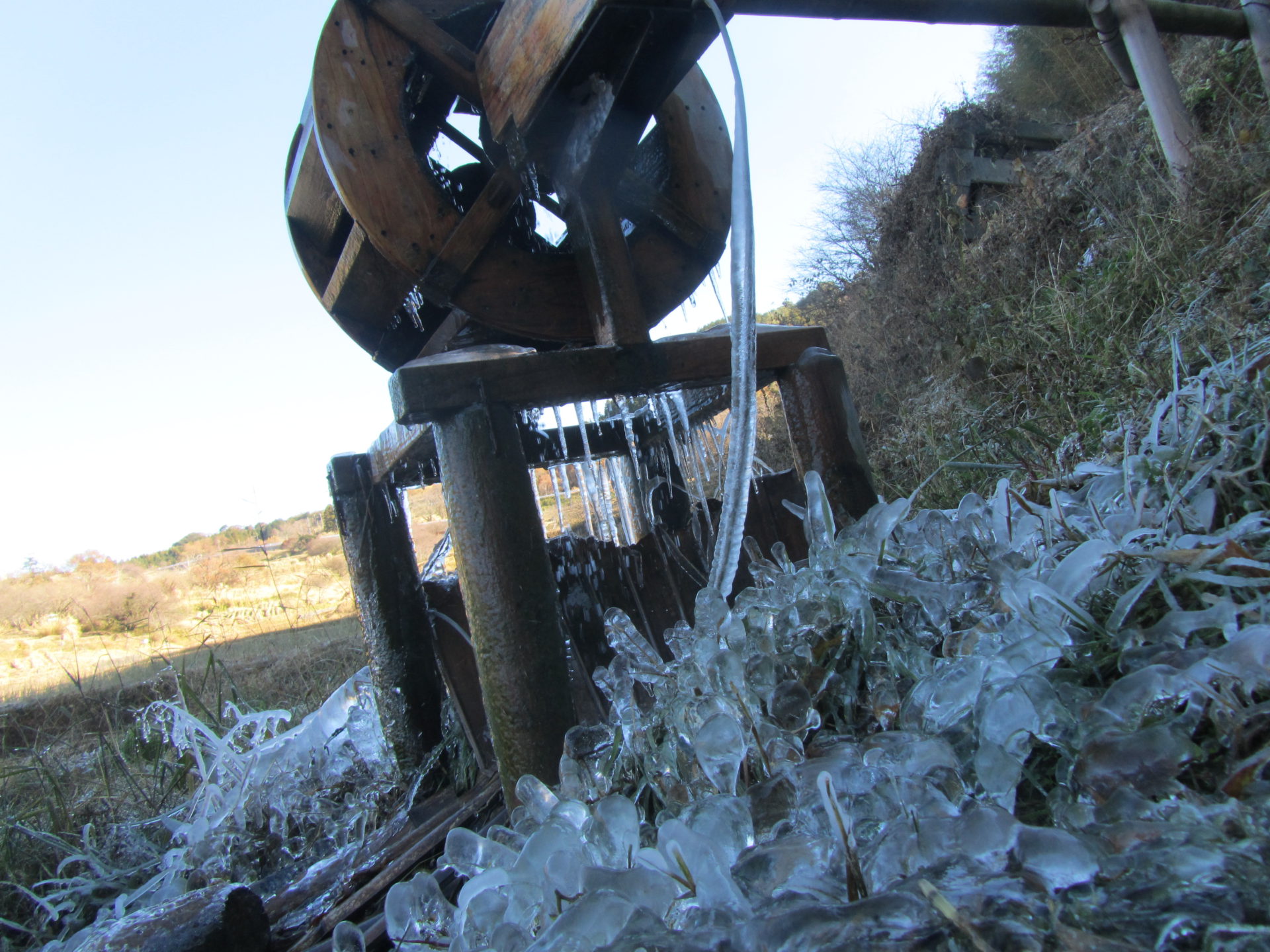 茶園に置いた温度計は-2度になりせんがまちの水車