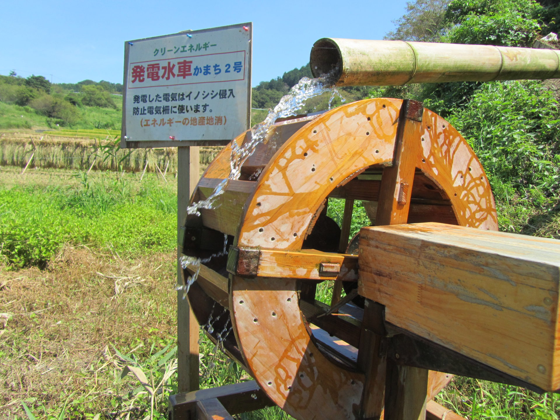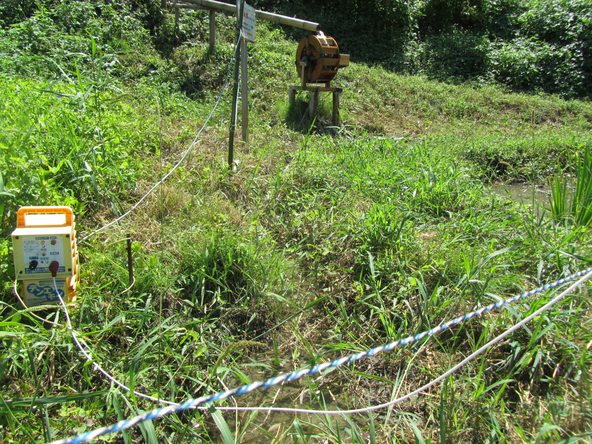 発電された電気は棚田外周に張られたイノシシ除けの電気柵に使用します。