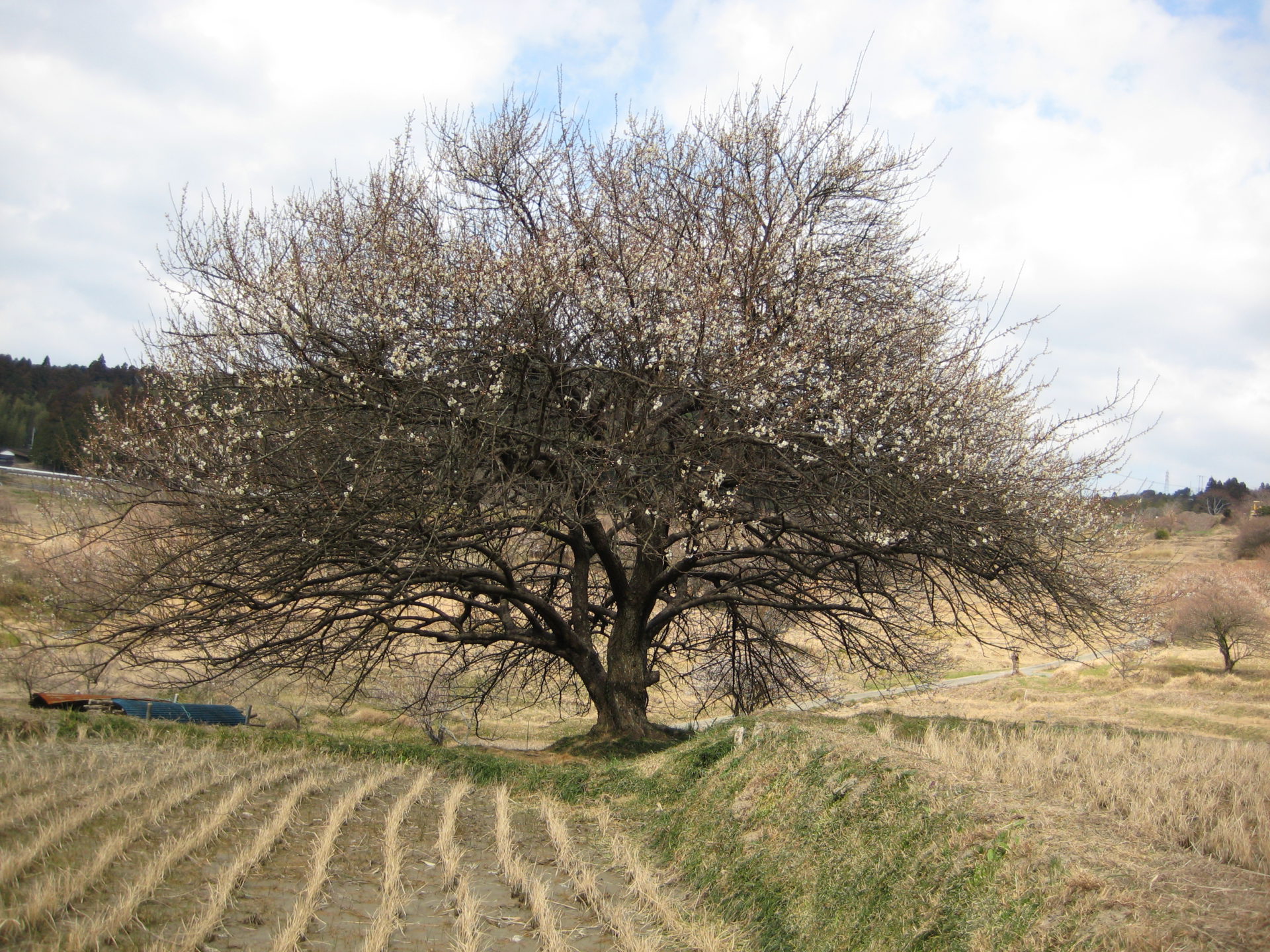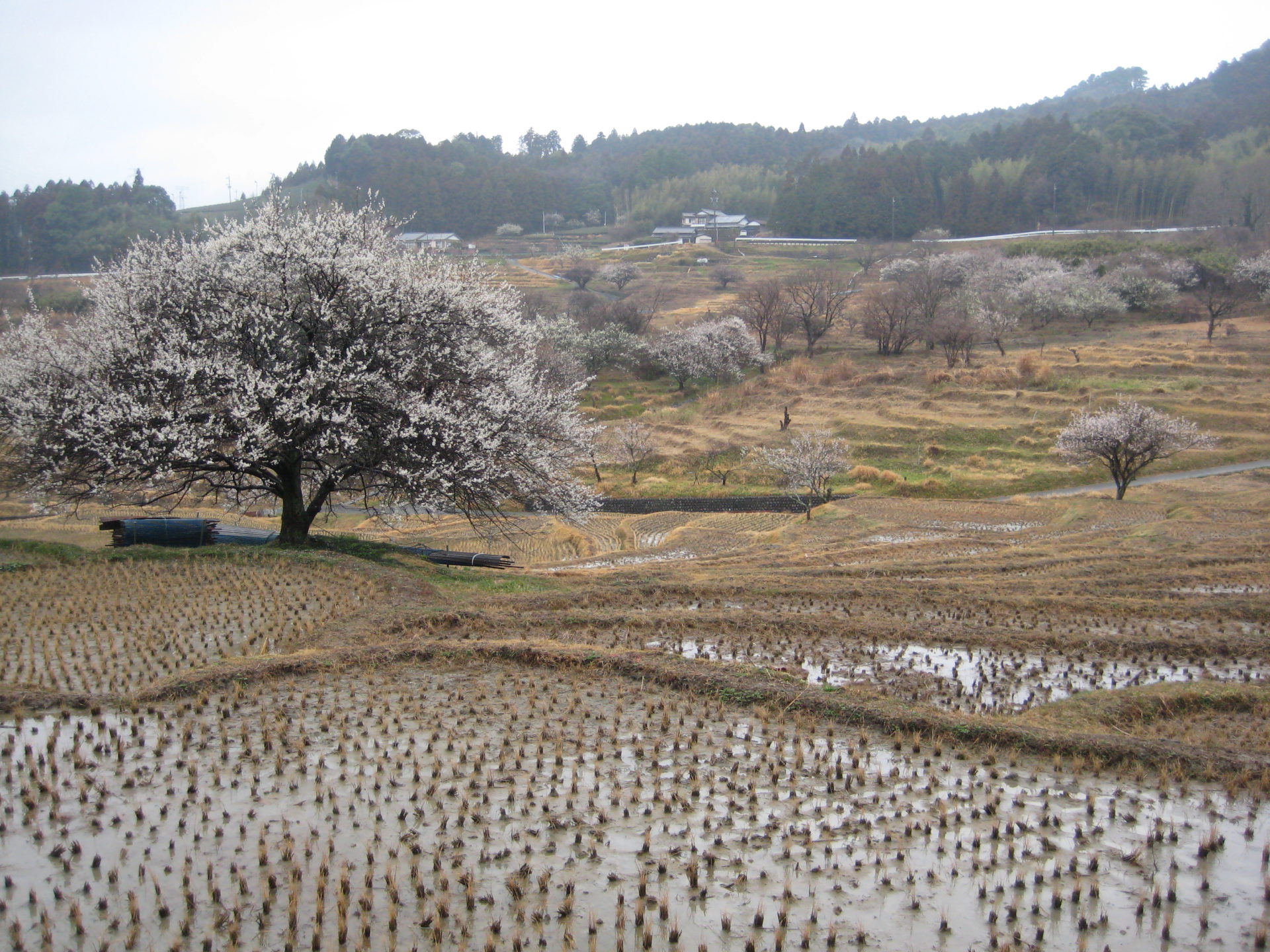 梅の花も満開となり、それを見ながら頬張る棚田米のおにぎりは