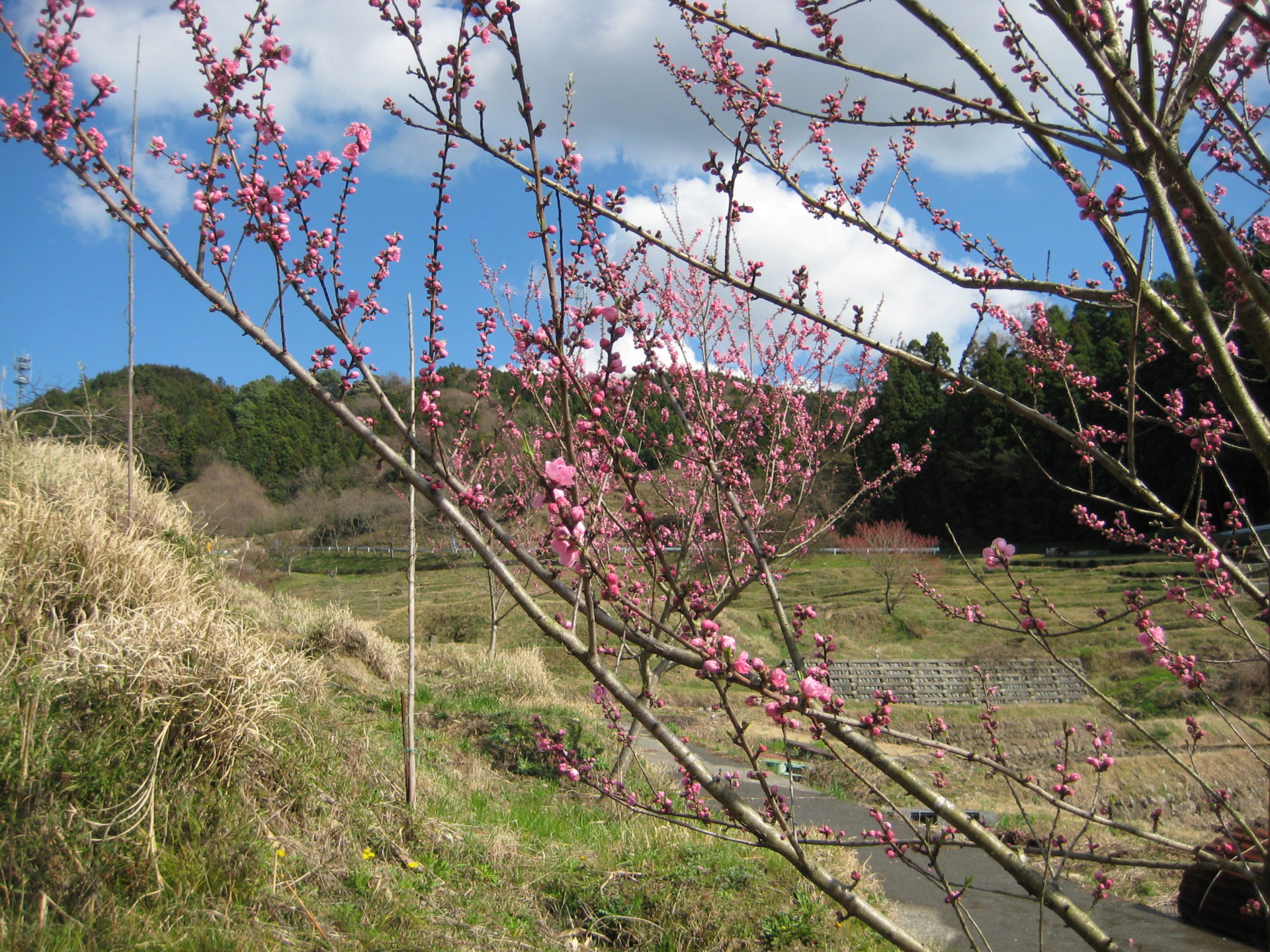 せんがまちの棚田では桃の花が見ごろを迎えています。
