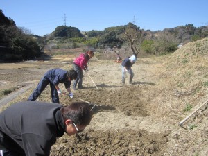 耕運機とクワを用いてまずは土を耕します。粘土質なのでできるかぎり粒子を細かく!