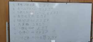 午前のレクリエーションは、最近先輩方の間で流行っている”ito”というゲームをしました。それぞれ振り分けられた1〜100の数字を直接言わずに表現し、数の小さい人から順番に並ぶというゲームなのですが、これが想像以上に難しい…!私のチームは5回中1回しか成功できませんでした😢でも失敗するたびに笑いが起き、気づいたらすごく盛り上がっていました。一気に1年生と距離が縮まった気がします。